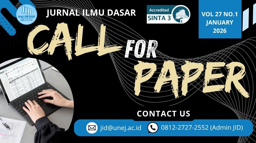 Jurnal ILMU DASAR (JID) is a national peer-reviewed and open access journal that publishes research papers encompasses all aspects of natural sciences including Mathematics, Physics, Chemistry and Biology JID publishes 2 issues in 1 volume per year. First published, volume 1 issue 1, in January 2000 and avalaible in electronically since 2012. Jurnal ILMU DASAR is accredited SINTA 3 by the Ministry of Education, Culture, Research, and Technology of the Republic of Indonesia (Kemendibukristek), No. 152/E/KPT/2023 (September 25, 2023). All accepted manuscripts will be published worldwide JID has been indexed in: